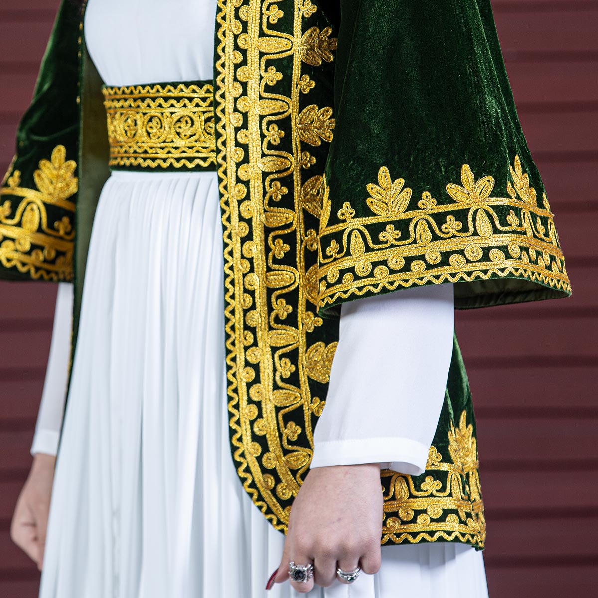 Close-up of hand embroidery gold zardozi detail on Afghan velvet dress